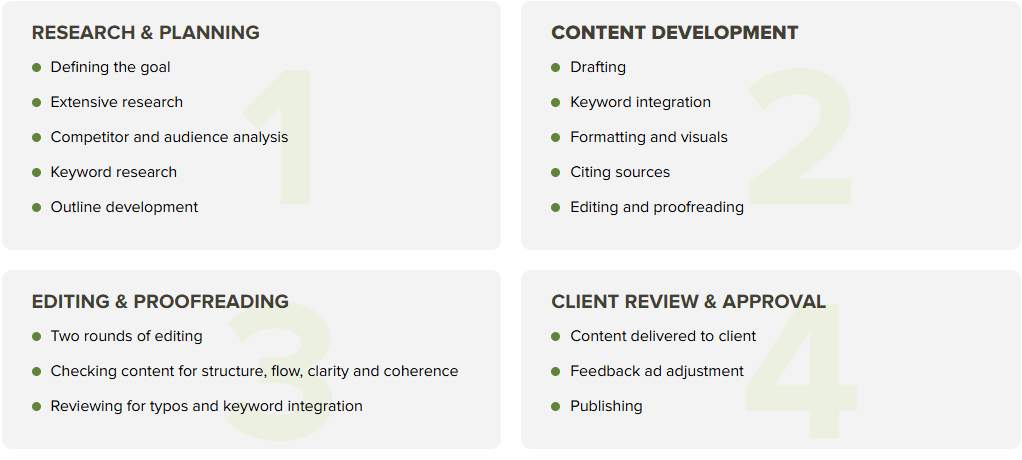 Unlike other content marketing services providers that outsource most of their content, we keep our content in-house to control the quality of the content from start to finish. We have 20+ content experts – writers and editors included – working together to deliver the highest quality content.